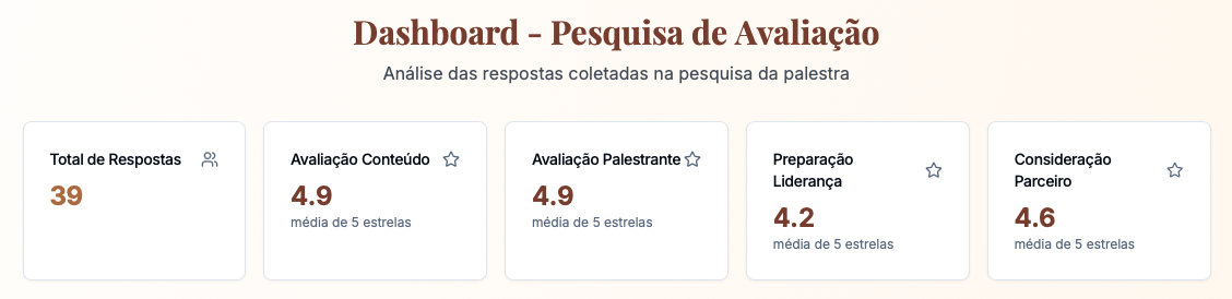 Dashboard em tempo real: Uma página restrita para a cliente, com um painel visual que exibe as notas e comentários da pesquisa em tempo real, permitindo que ela meça o impacto da sua palestra instantaneamente.